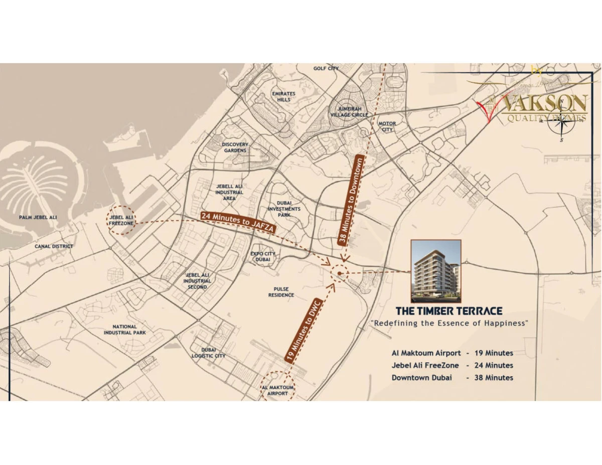 Strategically situated in Abu Dhabi, Timber Terrace Residence provides easy access to major highways, commercial districts, and cultural landmarks. Residents can enjoy proximity to shopping centers, schools, and healthcare facilities, making it an ideal choice for families and professionals alike.