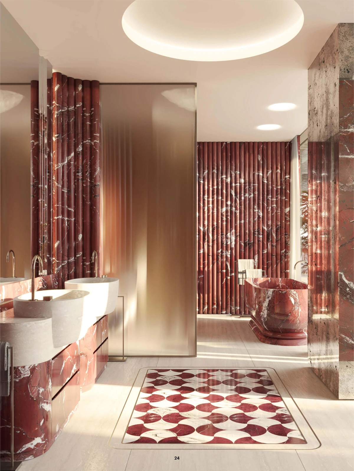 Each space is a sensorial study in stillness. Light and shadow. Raw and polished. Hidden and exposed. Nothing is incidental. Décortiqué Surfaces are stripped to their essential form. Structures feel paused mid-process. Raw meets refined, inviting reflection on the unfinished and the real. The Memory of … Time is made visible. A rusted mirror resists clarity. A shadow in stone lingers. Every surface suggests a past, a presence, a trace. Margiela Whites Maison Margiela’s signature white becomes a field for interpretation, nuanced, tonal, and ever-shifting. Travertine and plaster blend into chromatic silence. Anonymity of the Lining That which is typically hidden – stitching, lining, the architecture of structure – is revealed, elevated to ornament. The Unexpected A disruption of symmetry. A flash of neon. A mirrored surface that distorts. The familiar is abstracted, inviting inquiry over assumption.