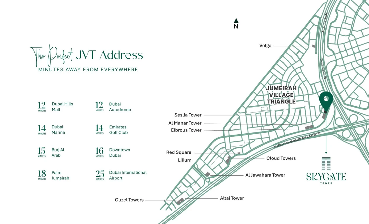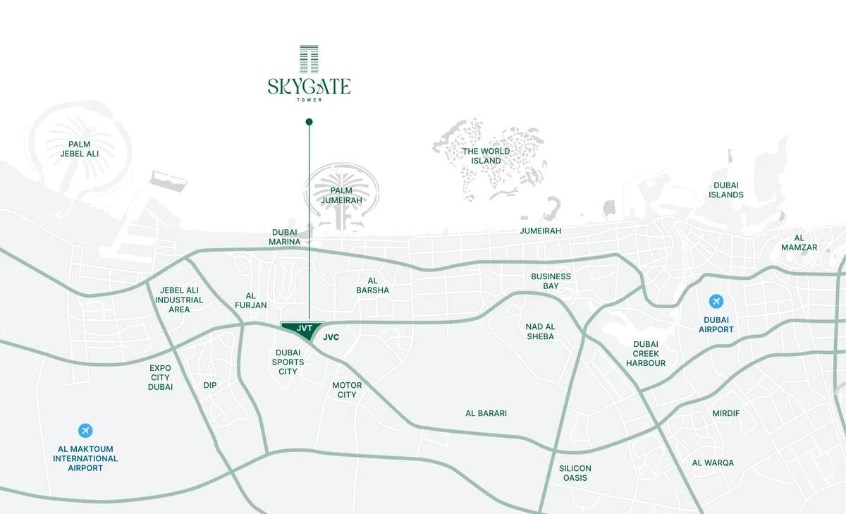 SkyGate Tower by Tiger Properties is a 43-storey landmark rising in Jumeirah Village Triangle, blending modern architecture with nature-inspired living.