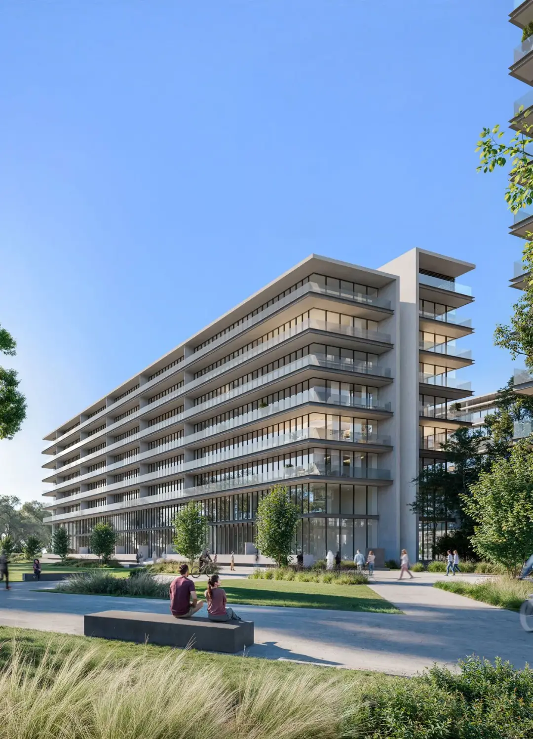 Inside, The Gate 5 presents a curated selection of residences ranging from elegant one-bedroom apartments to spacious family homes. Each unit is equipped with smart home technologies and premium European kitchen appliances, including a cooker, hood, and washer-dryer. Many homes feature “winter gardens”, extending the living area seamlessly onto the balcony, creating bright and airy interiors that celebrate both indoor and outdoor living. The design emphasizes natural light, open layouts, and a refined aesthetic that perfectly complements the urban surroundings.