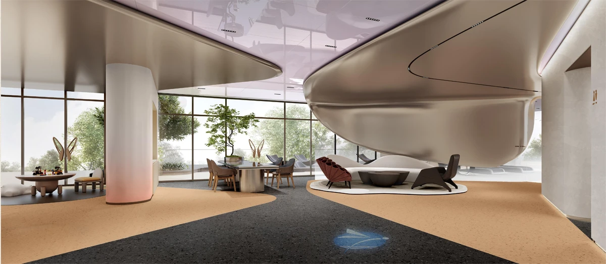 The facade and curvilinear forms evoke the dragonfly’s gossamer wings and streamlined body, blending organic fluidity with structural precision.