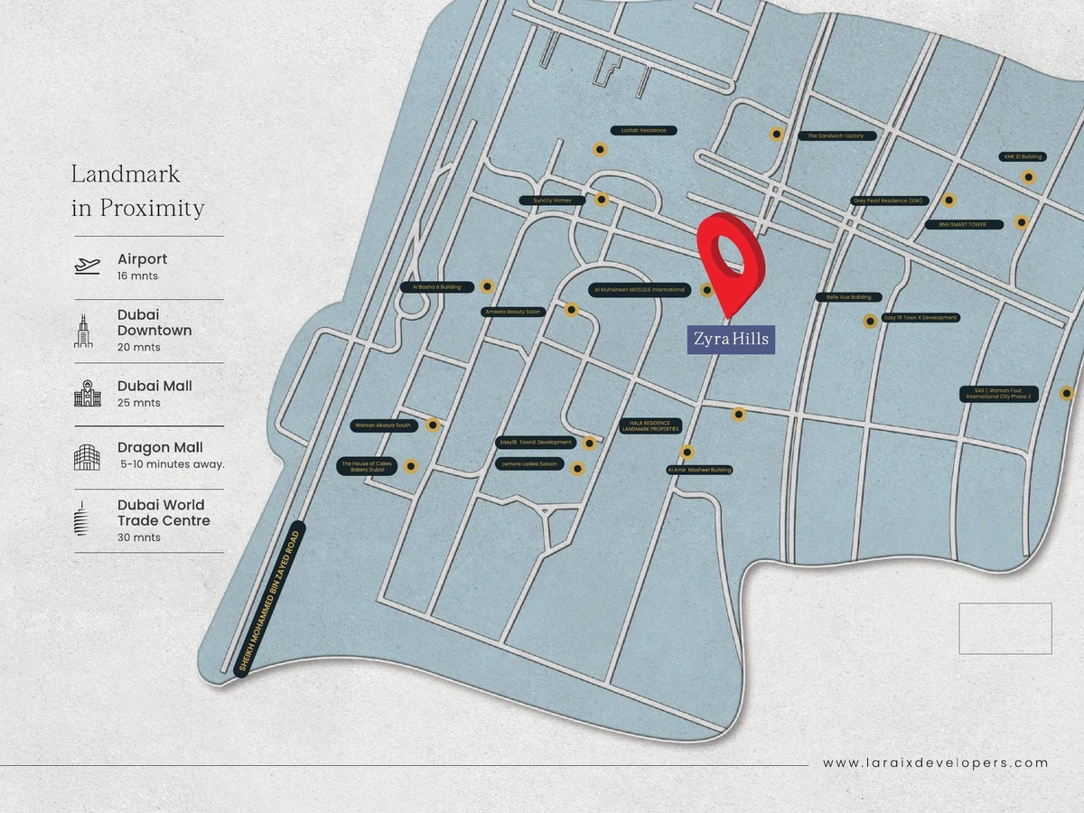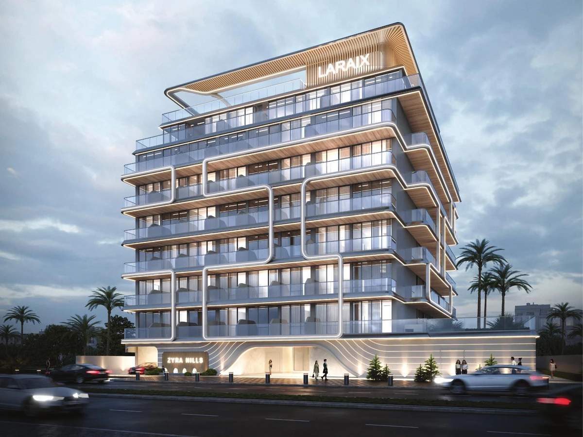 Zyra Hills by Laraix Developers redefines the meaning of urban tranquility, offering a seamless fusion of contemporary architecture and natural serenity. Following the success of Zyra Vista, this masterpiece rises in Al Warsan 4, surrounded by greenery and calm, yet connected to the vibrant pulse of Dubai. Its graceful façade and thoughtfully designed spaces create an atmosphere of refined living where every detail evokes balance, beauty, and sophistication.